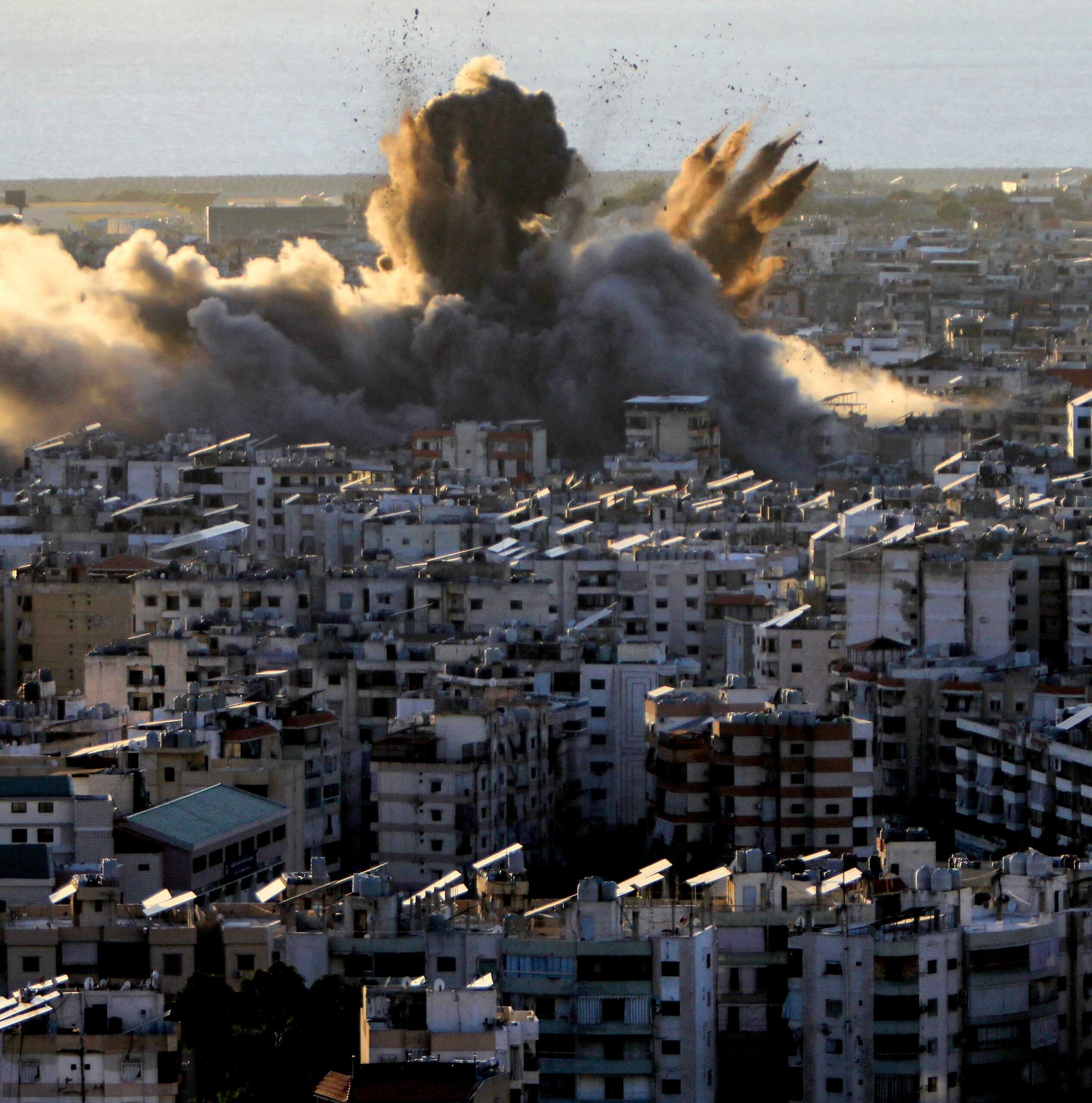 A powerful explosion sends a massive cloud of smoke and debris into the sky above a densely populated city. The dramatic scene underscores the impact of such events on urban landscapes.